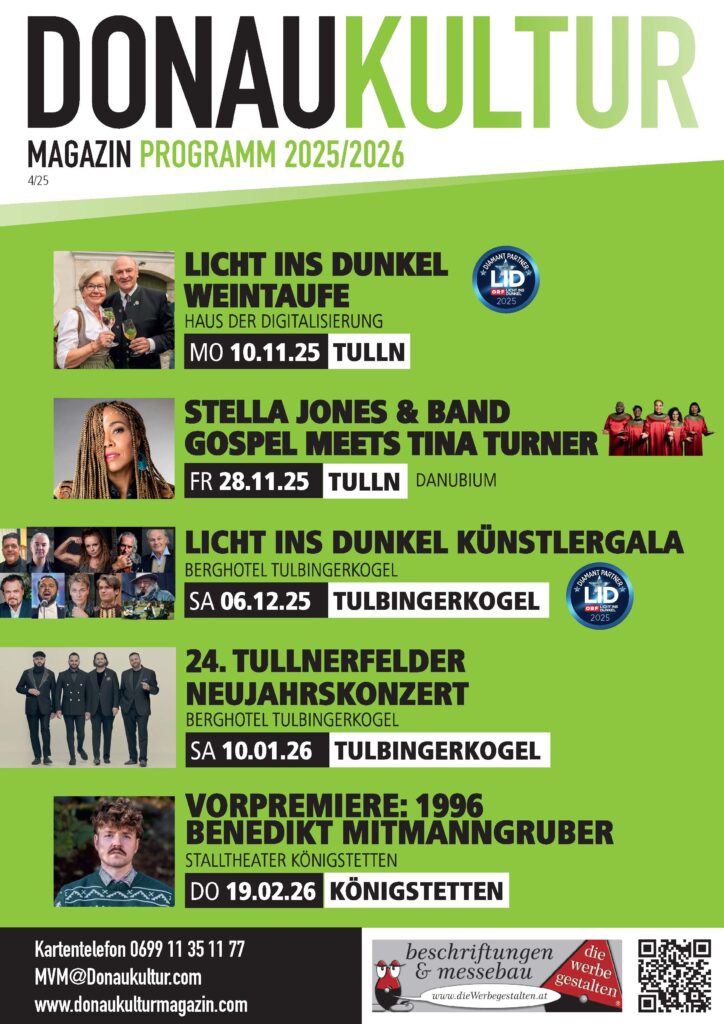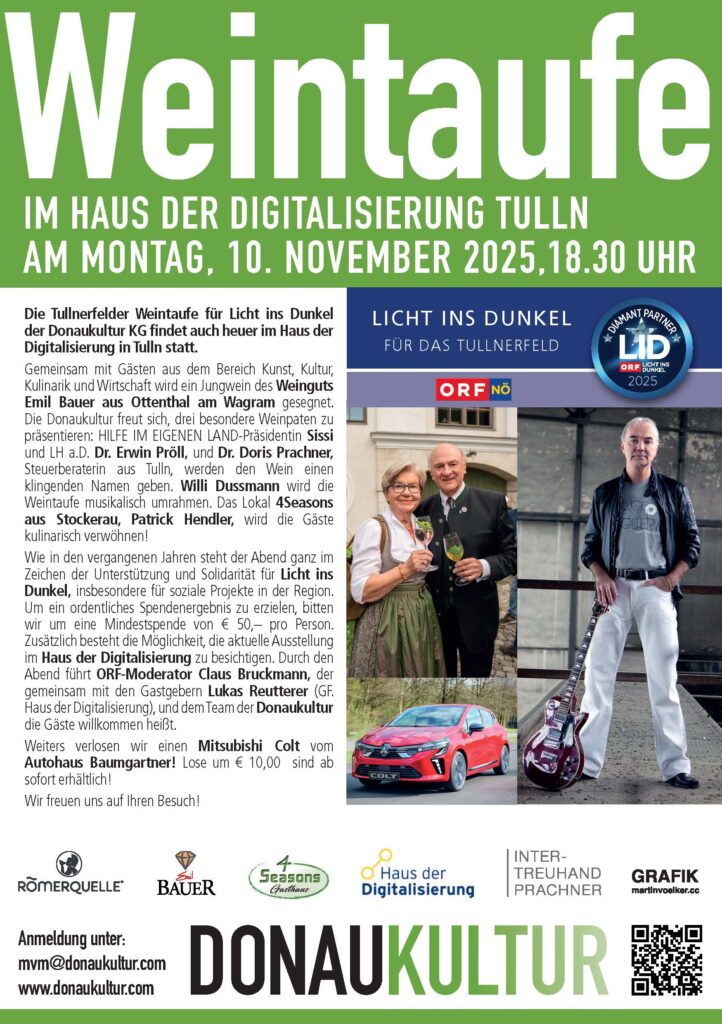 Die Weintaufe für Licht ins Dunkel der Donaukultur KG findet auch heuer im Haus der Digitalisierung in Tulln statt. Gemeinsam mit Gästen aus dem Bereich Kunst, Kultur, Kulinarik und Wirtschaft wird ein Jungwein des Weinguts Emil Bauer aus Ottenthal am Wagram gesegnet. Die Donaukultur freut sich, drei besondere Weinpaten zu präsentieren: Sissy und Erwin Pröll sowie Dr. Doris Prachner (Intertreuhand Prachner Tulln) werden dem Wein einen klingenden Namen geben.